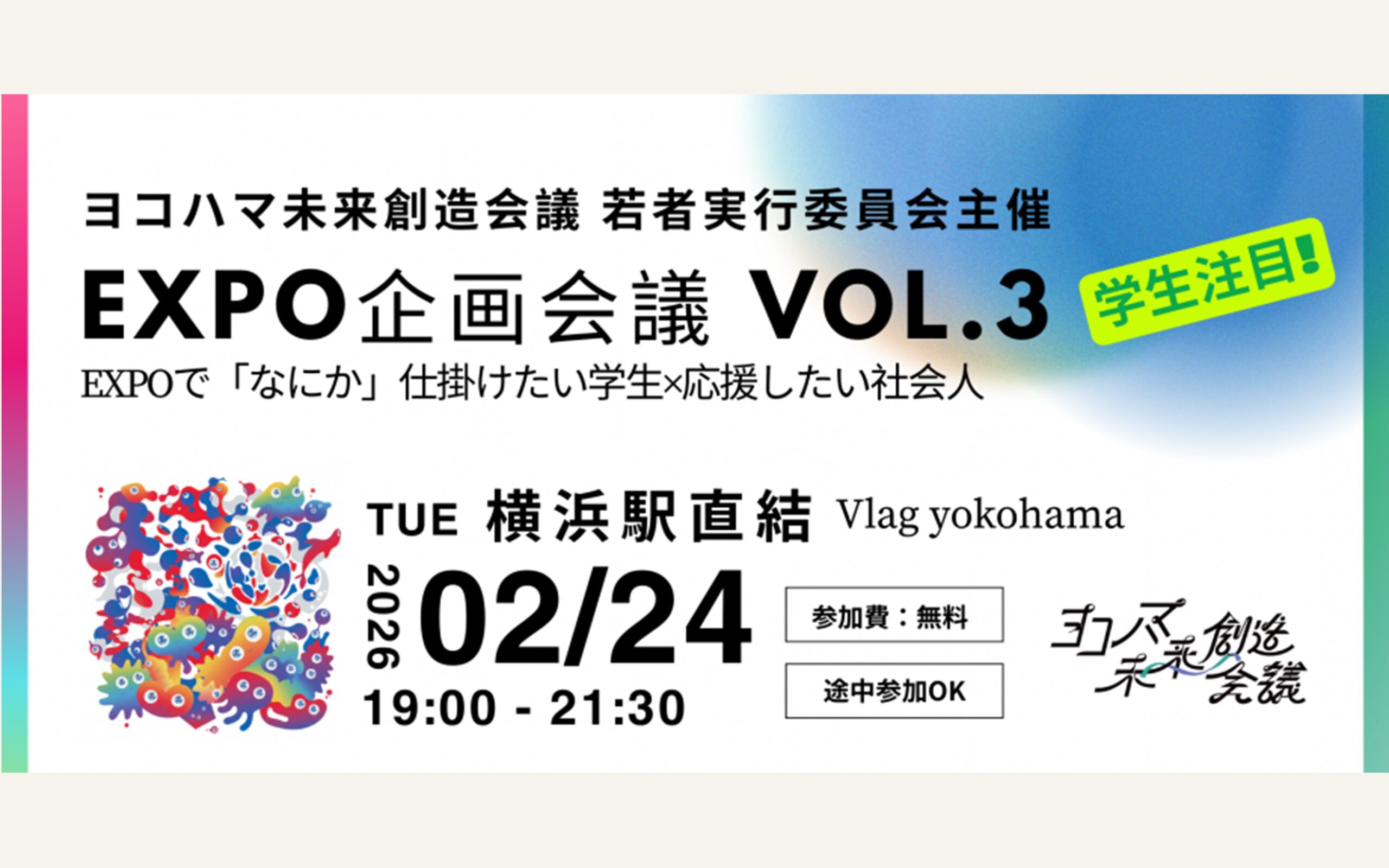 「何かやりたい」学生と「応援したい」社会人、集まれ。 大阪・横浜の両万博で走る学生を招き、来年に迫ったEXPOへのアクションを深掘り。横浜駅直結・地上42階の絶景の下、学生が主役となって未来を企てる「作戦会議」に参加しませんか?